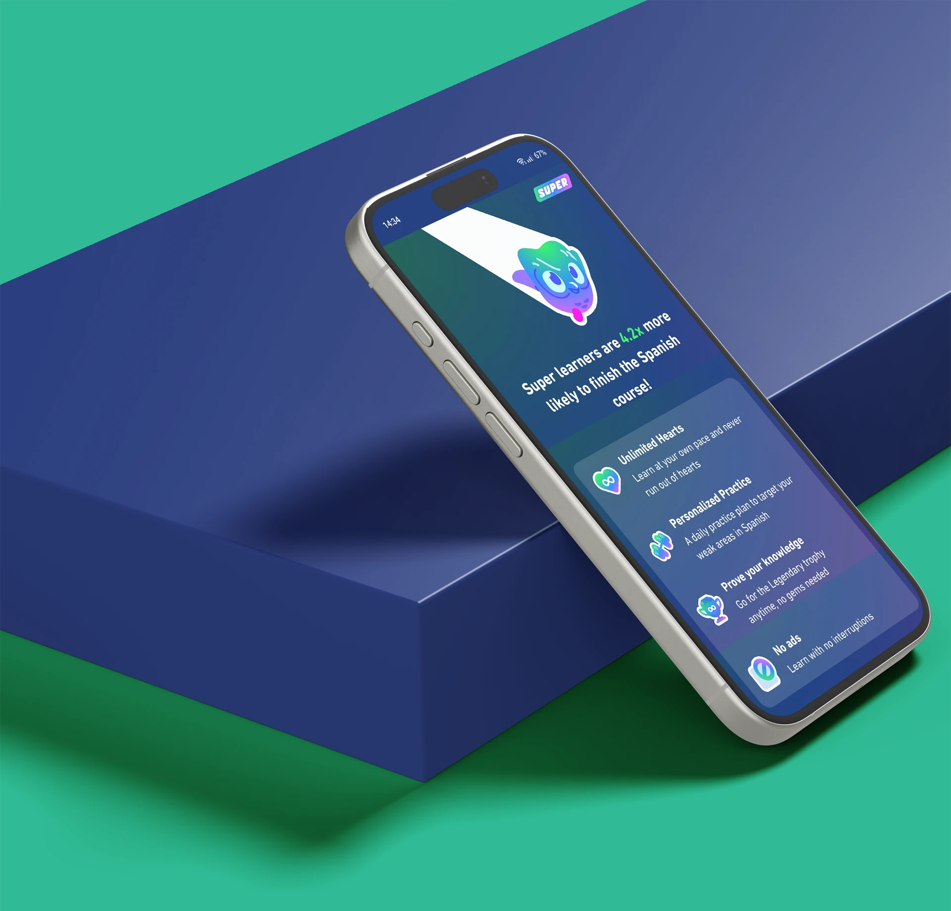 This will upgrade your Duolingo account from the free limited version to Super Duolingo (by adding you to a Super Duolingo family plan) for 1 month. After payment you will be added to the family plan automatically. In one month you will be emailed to see if you want another month. Enjoy all the benefits of Super Duolingo on all your devices within seconds!